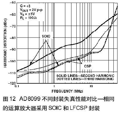 這種引腳排列還有一個好處就是降低了二次諧波失真。傳統運算放大器的引腳配置中引起二次諧波失真的一個原因是同相輸入和負電源引腳之間的耦合作用。LFCSP封裝的低失真引腳排列消除了這種耦合所以極大地降低了二次諧波失真;在有些情況下多可降低14 dB。圖12示出了AD80992 采用SOIC封裝和LFCSP封裝失真性能的差別。