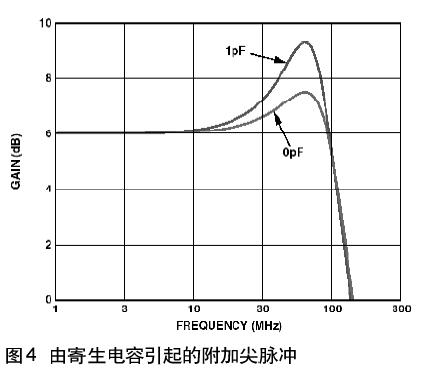 在高速電路中,很小的值就會影響電路的性能。有時候幾十個皮法(pF)的電容就足夠了。相關實例:如果在反相輸入端僅有1pF的附加寄生電容,它在頻率域可以引起差不多2dB的尖脈沖(見圖4)。如果寄生電容足夠大的話,它會引起電路的不穩定和振蕩。