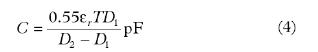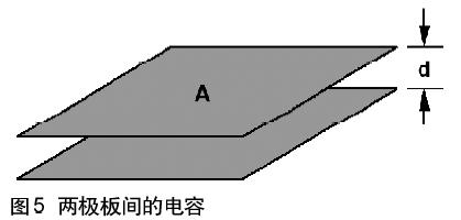 當尋找有問題的寄生源時,可能用得著幾個計算上述那些寄生電容尺寸的基本公式。公式(1)是計算平行極板電容器(見圖5)的公式。