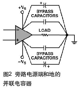 直接從運算放大器的電源引腳入手;具有小電容值和小物理尺寸的電容器應當與運算放大器置于PCB的同一面――而且盡可能靠近放大器。電容器的接地端應該用短的引腳或印制線直接連至接地平面。上述的接地連接應該盡可能靠近放大器的負載端以便減小電源端和接地端之間的干擾。圖2示出了這種連接方法。