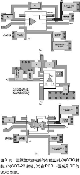 圖9示出了采用SOIC封裝(a)和SOT-23封裝(b)的運算放大器之間的布線區別。每種封裝都有它自身的一些問題。重點看(a),仔細觀察反饋路徑就發現有多種方法連接反饋。重要的是保證印制線長度短。反饋路徑中的寄生電感會引起振鈴和過沖。在圖9(a)和9(b)中,環繞放大器連接反饋路徑。圖9(c)示出了另外一種方法――在SOIC封裝下面連接反饋路徑――這樣就減小了反饋路徑的長度。每種方法都有細微的差別。一種方法會導致印制線過長,會增大串聯電感。二種方法采用了通孔,會引起寄生電容和寄生電感。在給PCB布線時必須要考慮這些寄生效應的影響及其隱含的問題。SOT-23布線差幾乎是理想的:反饋印制線長度短,而且很少利用通孔;負載和旁路電容從很短的路徑返回到相同的地線連接;正電源端的電容(圖9(b)中未示出)直接放在PCB背面的負電源電容的下面。