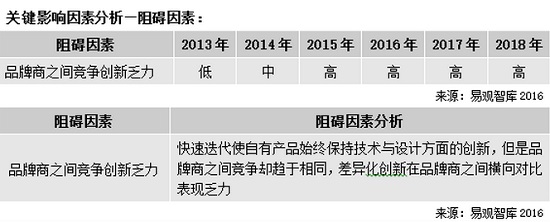 阻礙智能手機市場發展的因素其中之一是智能手機市場本身產品已缺乏新意,目前為了應對市場競爭,各家廠商的產品更新周期都在縮短,快速迭代雖然在同一品牌內能帶來技術提升,但是品牌之間橫向比較很難見到差異化創新,導致硬件產品之間競爭趨同。