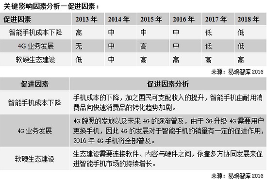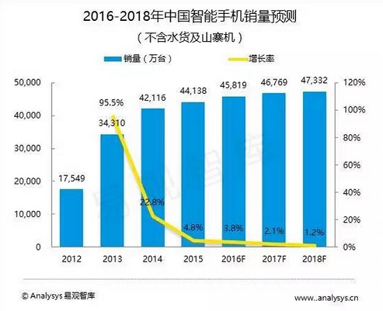根據Analysy易觀智庫數據顯示,預計2016年中智能手機銷量將達到4.41億,較2015年增長3.8%。預計2018年中智能手機銷量將在4.73億左右,整體增長速率呈現出下降趨勢。