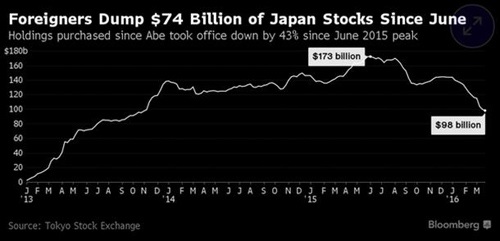 出于對安倍經濟學以及日本經濟前景的悲觀態度,彭博數據顯示,今年來交易員撤走了460億美元的資金,投資者已經連續十三周拋售日本股票,創1998年以來長連跌紀錄。東證指數下跌17%,這一表現之差僅次于意大利。