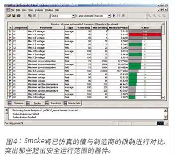 Smoke選項可以對電能耗散,連接點(diǎn)溫度增加,二次崩潰,或電壓/電流限制違例引起受壓的部件做出預(yù)警,經(jīng)過一定時間, 這些部件可能導(dǎo)致電路失敗,設(shè)計師可以用Smoke將電路仿真結(jié)果和部件的安全運(yùn)行限制進(jìn)行對比,如果超過限制,Smoke 就可以識別問題參數(shù),使用Smoke分析還可用于創(chuàng)建,修改和配置供使用的decrate 文件,見圖4。