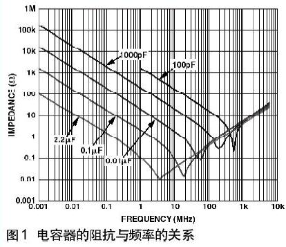 并聯不同的電容值的電容器有助于確保電源引腳在很寬的頻帶上只能看到很低的交流(AC)阻抗。這對于在運算放大器電源抑制比(PSR)衰減頻率處尤其重要。該電容器有助于補償放大器降低的PSR。在許多十倍頻程范圍內保持低阻抗的接地通路將有助于確保有害的噪聲不能進入運算放大器。圖1示出了采用多個并聯電容器的優點。在低頻段,大的電容器提供低阻抗的接地通路。但是一旦頻率達到了它們自身的諧振頻率,電容器的容性就會減弱,并且逐漸呈現出感性。這就是為什么采用多個電容器是很重要的原因:當一個電容器的頻率響應開始下降時,另一個電容器的頻率響應開始起作用,所以能在許多十倍頻程范圍內保持很低的AC阻抗。