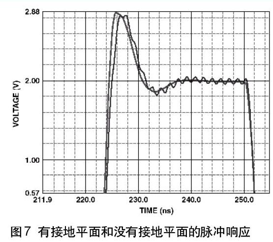 圖7中的振蕩示出了高速運算放大器同相輸入端長度為2.54 cm的印制線的影響。其等效寄生電感為29 nH(10-9H),足以造成持續的低壓振蕩,會持續到整個瞬態響應周期。圖7還示出了如何利用接地平面來減小寄生電感的影響。