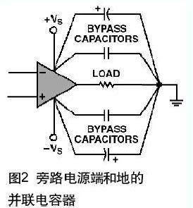 直接從運算放大器的電源引腳入手;具有小電容值和小物理尺寸的電容器應當與運算放大器置于PCB的同一面——而且盡可能靠近放大器。電容器的接地端應該用短的引腳或印制線直接連至接地平面。上述的接地連接應該盡可能靠近放大器的負載端以便減小電源端和接地端之間的干擾。圖2示出了這種連接方法。