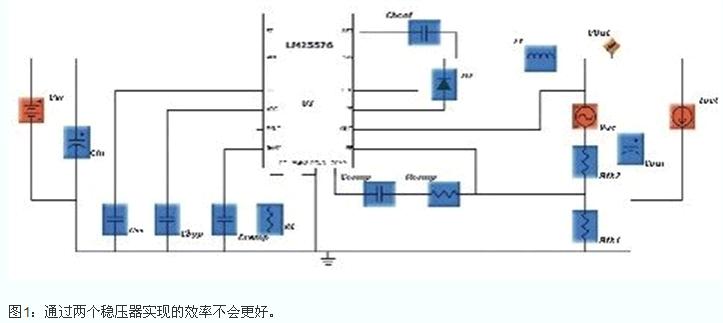 值得注意的是,高效率是84%,且此高效率是當(dāng)輸入-輸出間的壓差很低時實現(xiàn)的。此例中,輸入/輸出比大于7。一般情況下,可以用兩級電路來降低級與級之間的比率,但通過兩個穩(wěn)壓器實現(xiàn)的效率不會更好。
