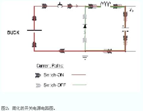 圖2所示的簡化電路圖對了解基本情況幫助甚大。看一看電流通路:把FET在導(dǎo)通狀態(tài)下的回路標(biāo)記為紅色;把FET在截至狀態(tài)下的回路標(biāo)記為綠色。我們可以觀察到兩種不同情況:有兩種顏色的區(qū)域和僅一種顏色的區(qū)域。我們必須特別關(guān)注后一種情況,因此時電流在零和滿量程之間交替變化。這些是具有高di/dt的區(qū)域。