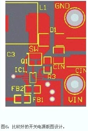 圖6是一個比較好的版圖設(shè)計。主要元件是一款與外部FET配合使用并采用MSOP-8封裝的控制器。注意CIN附近的空間,該電容的接地點直接連至二極管陽極。你無法使“電源地”內(nèi)的導(dǎo)線更短!FET[SW]可向上移動幾毫米以縮短陰極-電感-FET之間的導(dǎo)線。