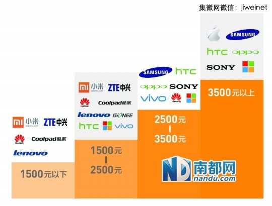 如此一來,市面上3500元以上價位的品牌僅剩下蘋果(108.6, -0.80, -0.73%)、三星和H T C 3家,而高端市場的多樣化需求卻仍然存在。誰來填補空位?在“沖高”征程上苦苦奮斗了10年的產品牌們,仿佛見到了前所未有的市場機遇。