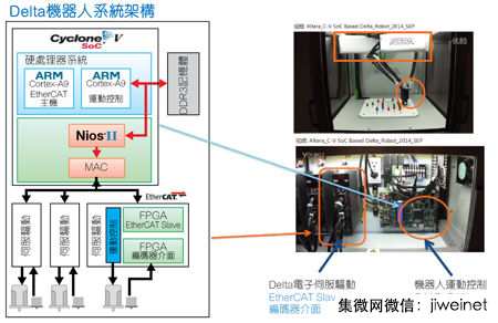 目前市場上比較少見使用單晶片來實現工業機器人的主機控制。從圖中的系統架構圖可以看到,在主晶片Cyclone V SoC中,雙核心Cortex A9中有一個核心作為運動控制,另一個核心用來執行EtherCAT主機。雙核心各自負責自己的功能,運動控制功能主要執行機器人3只手臂的協調工作,演算法都放在ARM核心。FPGA主要用來執行Nios軟核心功能。透過FPGA中的MAC連接3個伺服驅動器。據江允貴透露,參考設計中的伺服驅動來自臺達電子(Delta)。每個伺服驅動中都有一個FPGA用來做EtherCAT介面。目前伺服驅動中的演算法還是透過DSP來實現。