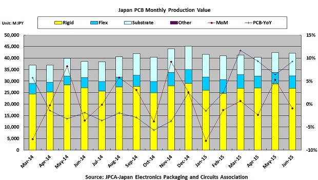 來(lái)源:日本2015年6月PCB總產(chǎn)值: 44,152 百萬(wàn)日元