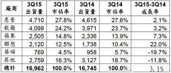 (來源:Gartner,2015年10月;備注:以上數據包含桌上型PC、筆記型PC與頂級ultramobile機種。所有資料均根據初步調查結果所推估,后推估值可能有所變動。本統計數據以銷售到通路的出貨量為準。因采自舍五入,個別數字加總可能有別于總計數量。)