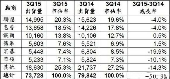 根據統計顯示,2015年三季全球個人電腦(PC)出貨量總計7370萬臺,較2014年三季下滑7.7%。桌上型PC出貨依舊疲軟,萎縮幅度落在高個位數(high-single-digit)區間,筆電與頂級ultramobile(例如MacBook Air與微軟Surface Pro)則呈現低個位數(low-single-digit)下滑。