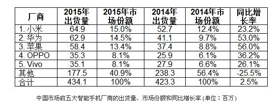蘋果鞏固了其三的位置(如下圖所示),市場(chǎng)份額從2014年的8.8%增加至2015年的13.4%,平均售價(jià)提高15.7%至718美元,增加近100美元。